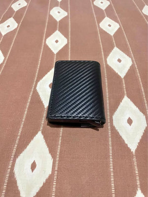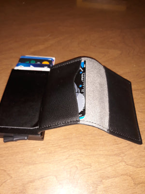 La billetera puede contener de 6 a 8 tarjetas en su mecanismo pop-up, además de espacio adicional para efectivo y más tarjetas en los compartimentos internos.