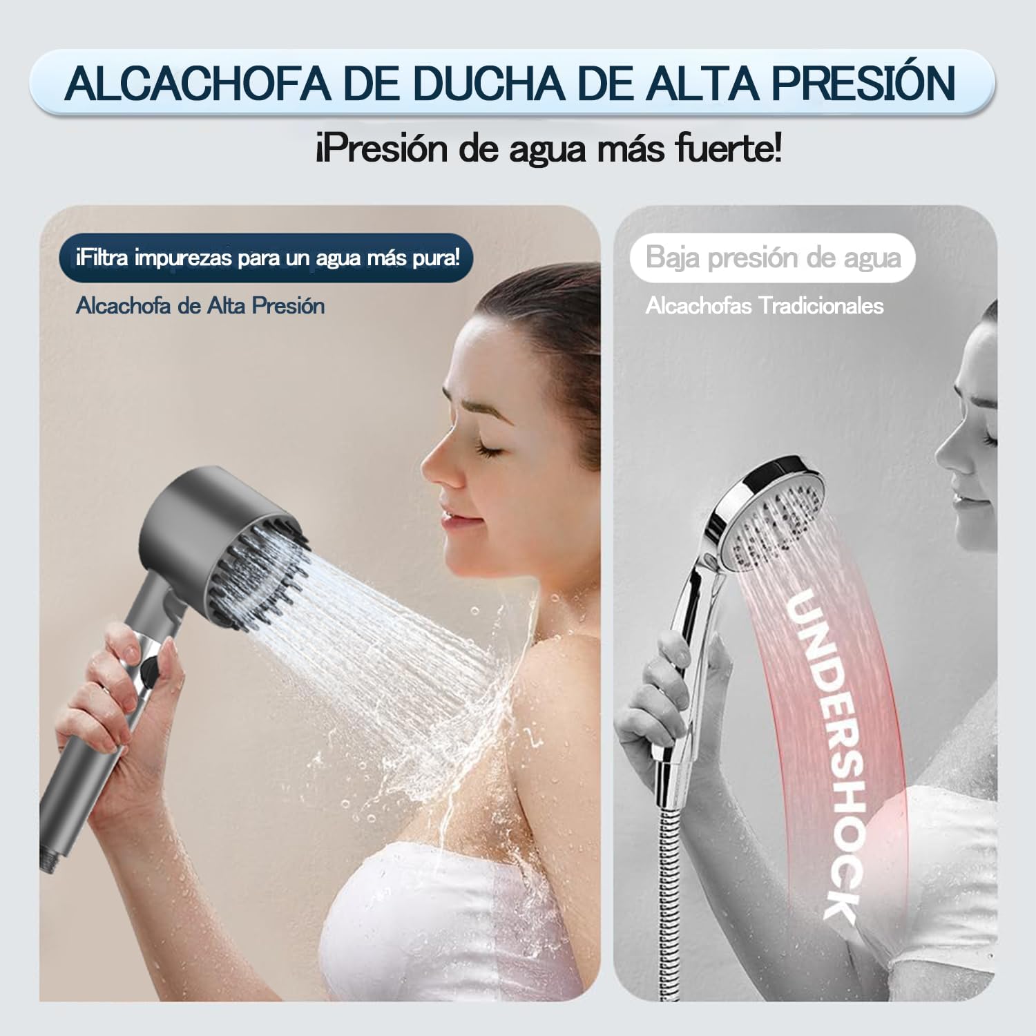 Convierte agua débil en un chorro potente. Disfruta duchas energizantes aunque la presión sea baja, perfecto para baños antiguos o edificios con baja presión.