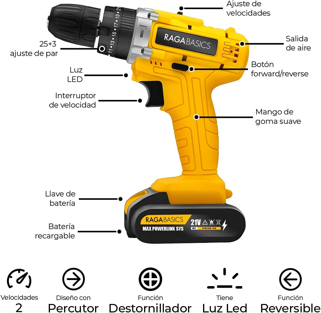 Diseño ergonómico, función reversible y velocidades variables facilitan el uso. Ideal para manitas, bricolaje y profesionales que buscan practicidad.