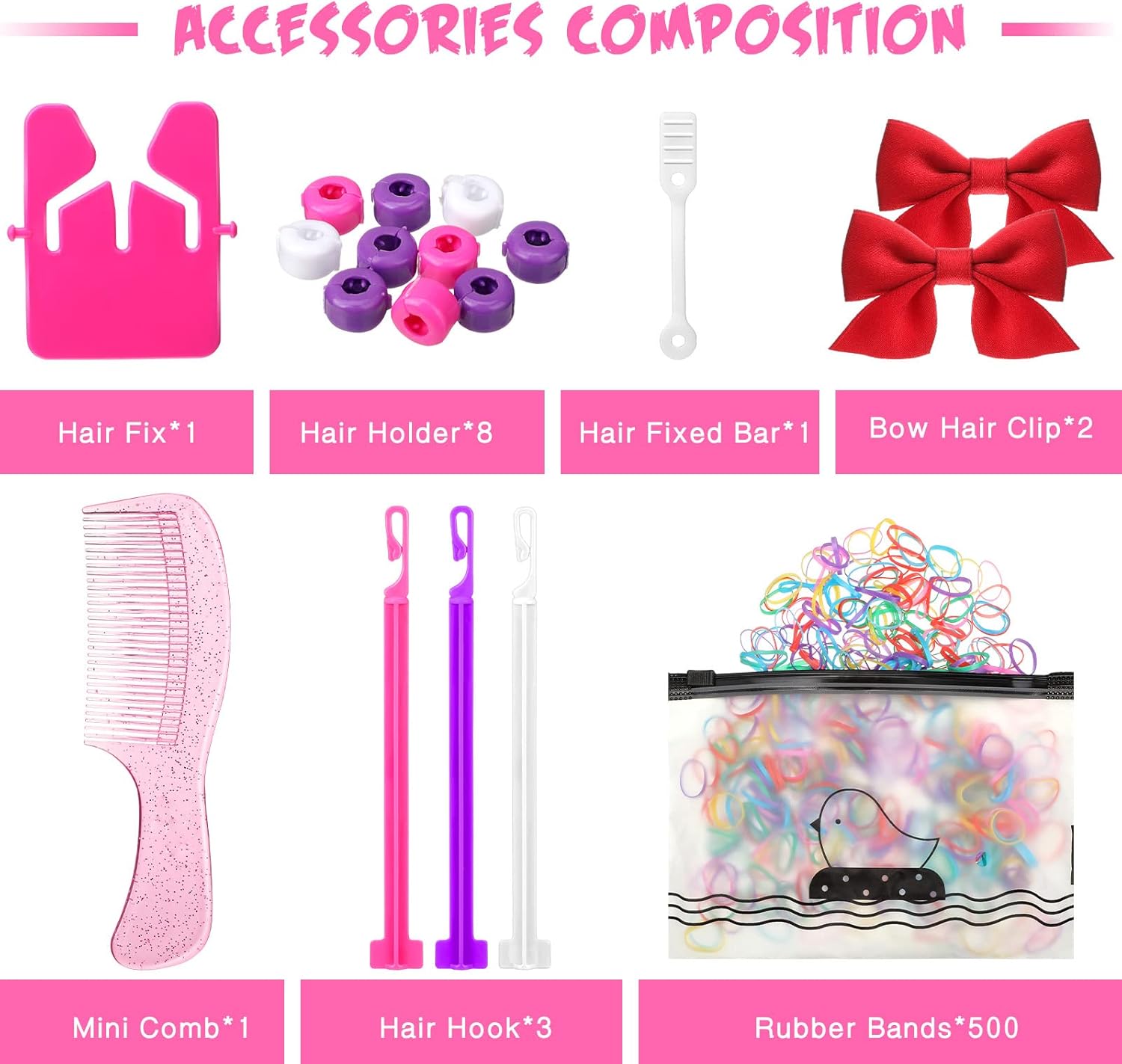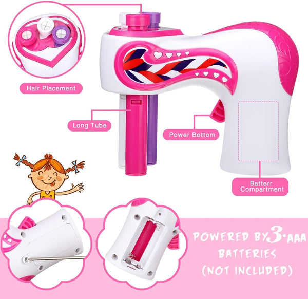 Incluye el trenzador automático, bandas de goma coloridas y lazos para el cabello.